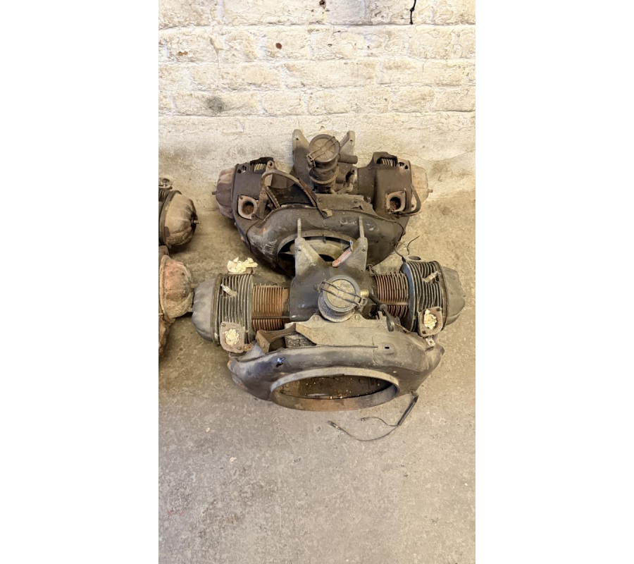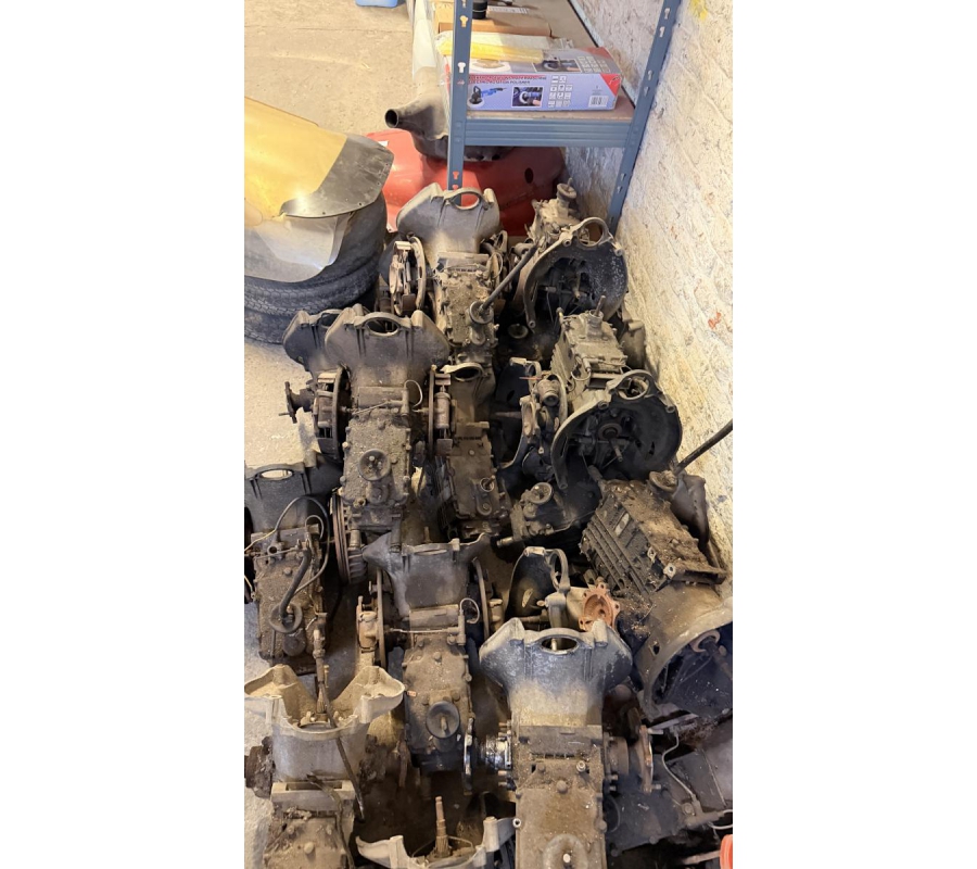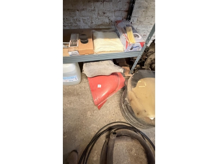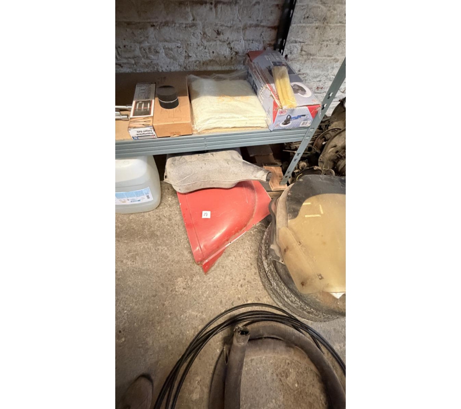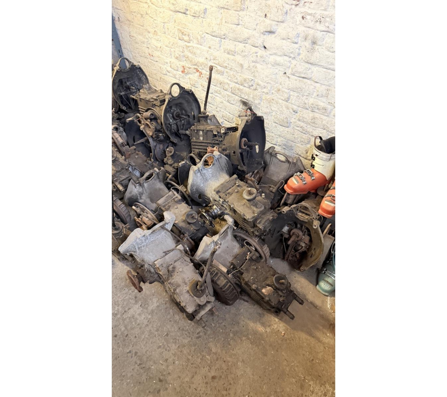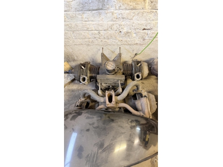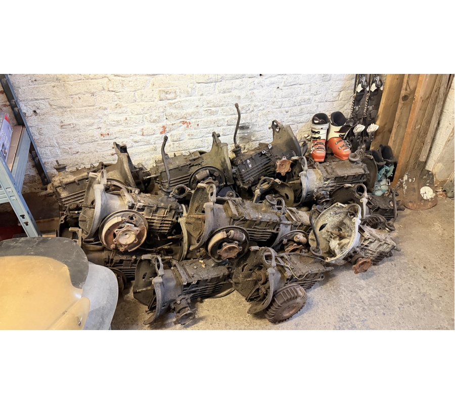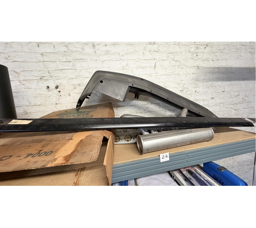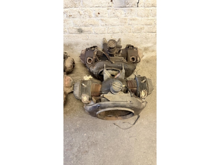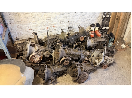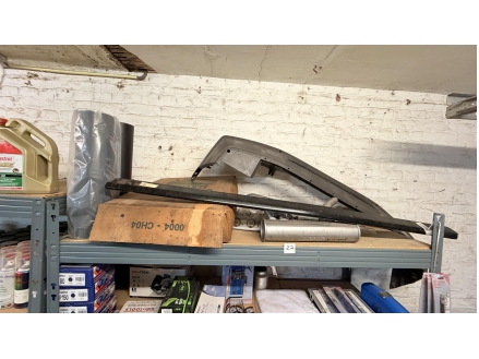 Lot de pièces neuves (un pot d'échappement 2CV, un bas de caisse 2CV, deux pots de suspension vide 2CV, deux pare-chocs avant 2CV, un pare-chocs avant Citroën Bx ou VISA, un radiateur Citroën BX 1400) et lot de pièces d'occasions (lots de boites de vitesse 2CV et Diane, trois bulles pour moto BMW, deux ailes arrières de 2CV, un réservoir 2CV, une aile avant 2CV, six moteurs 2CV et un réservoir de Fiat Flavie résiné)